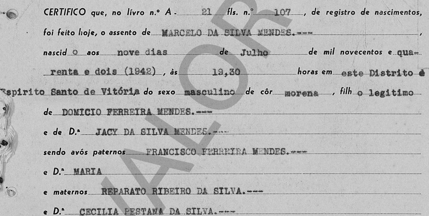 - Marcelo da Silva Mendes (09/07/1942, às 19,3 horas, em Vitoria-ES) c.c. Vera Federici Mendes, filha de Almir Federici e Octavia Dias Federici