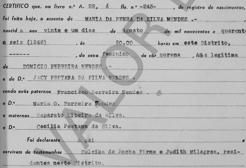 - Maria da Penha da Silva Mendes (solteira) (21/08/1946, às 20 horas, em Vitoria-ES)