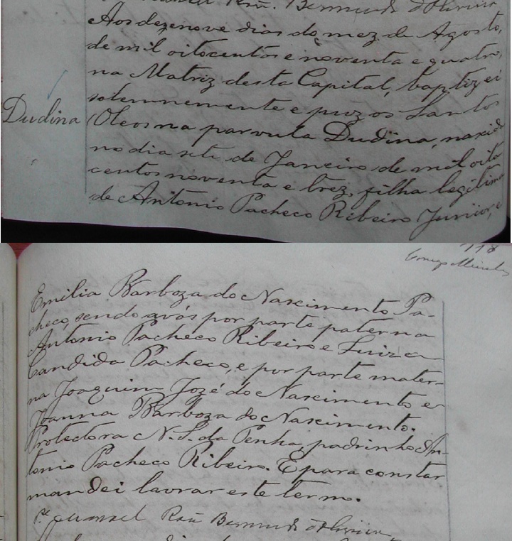 - Dudina, nascida no dia 07/01/1893, batizada no dia 19/08/1894, na Matriz da Capital-ES