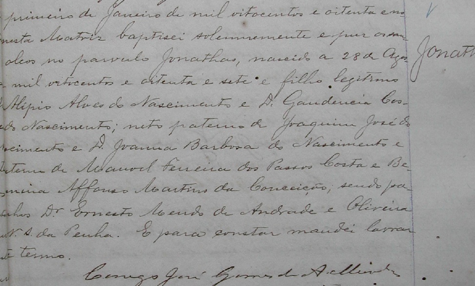 - Joanatha, nascido no dia 28/08/1887, batizado no dia 01/01/1889, na Matriz de Vitoria-ES