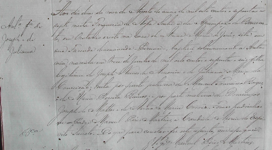 - Antonia (branca), nascida no dia 13/06/1866, batizada no dia 10/08/1867