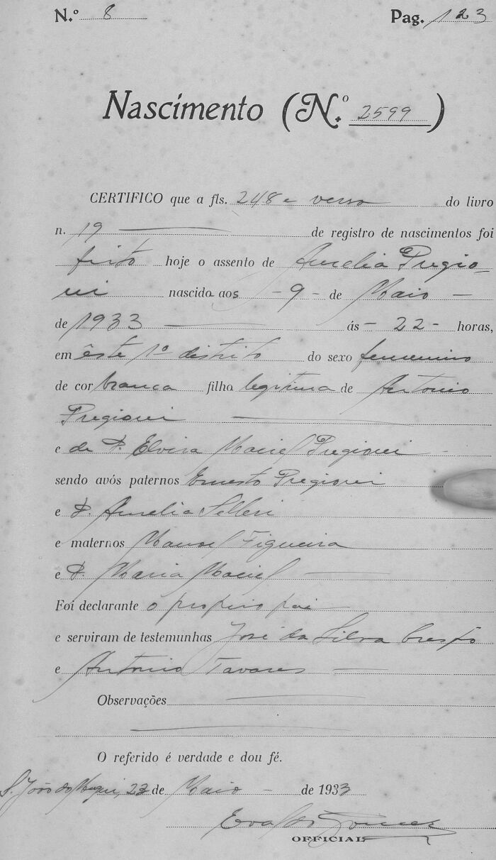 - Amelia Pregioni, nascida no dia 09/05/1933, às 22 horas, em Muqui-ES