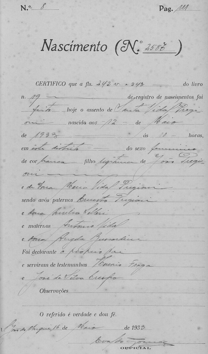 - Santa Vidal Pregiono, nascida no dia 12/05/1933, às 10horas, em Muqui-ES