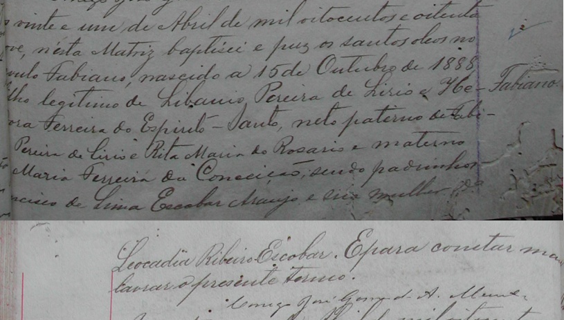- Fabiano, nascido no dia 15/10/1888, batizado no dia 21/04/1889, na Matriz de Vitoria-ES