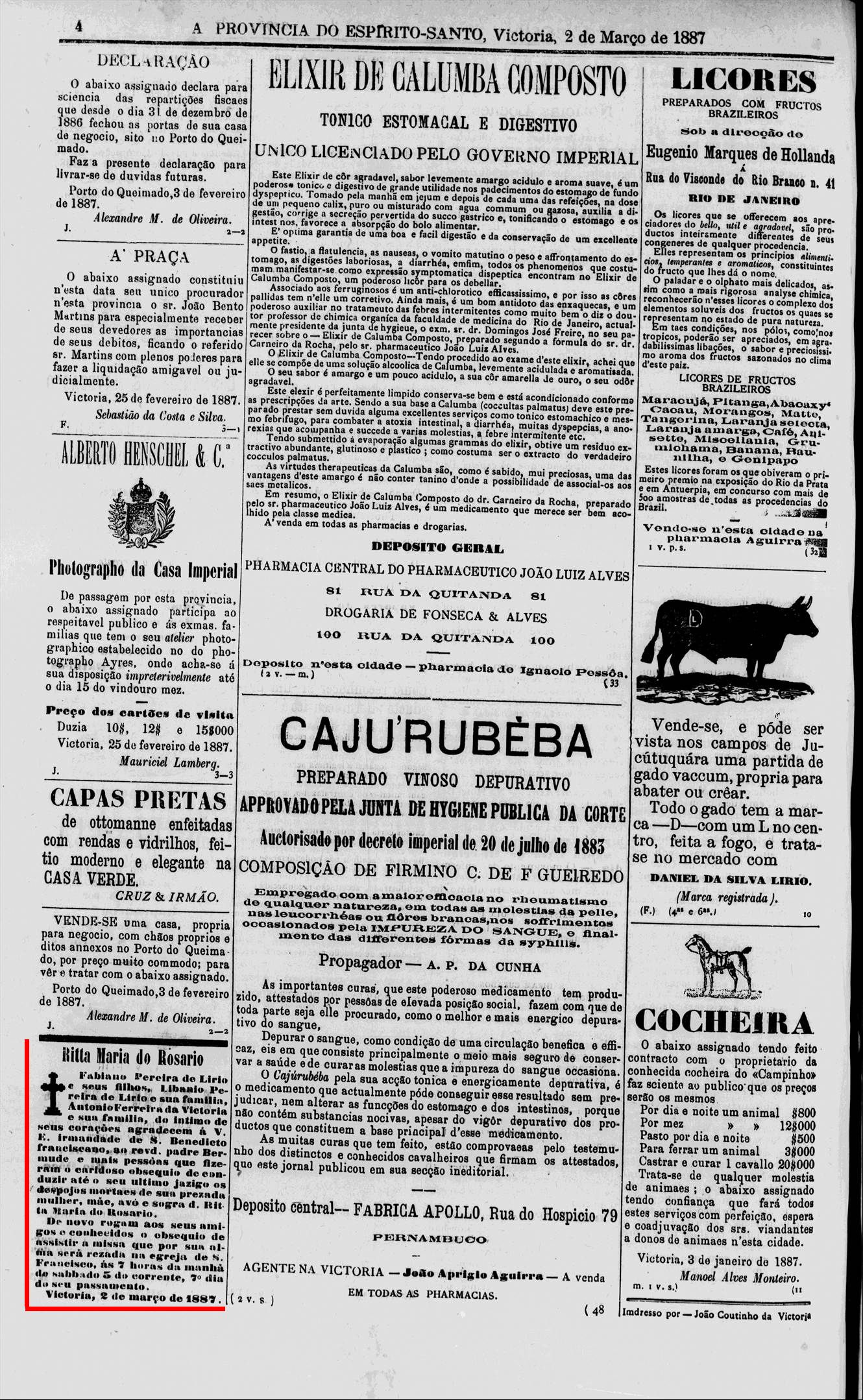 (Hipótese) Maria Pereira de Lirio c.c. Antonio Ferreira da Victoria, com base no jornal abaixo