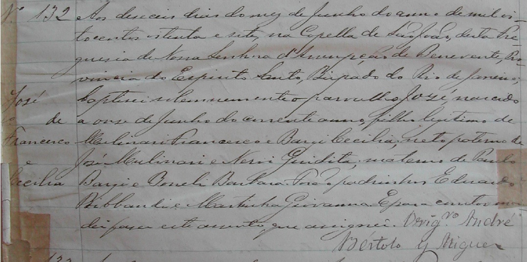 - Jose, nascido no dia 11/06/1887, batizado no dia 16/06/1887, na Capela de São João da Freguezia de Nossa Senhora da Assumpção de Benevente-ES