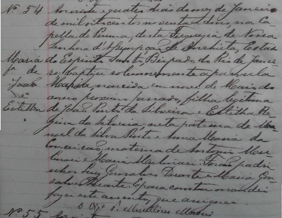 - Maria, nascida no dia 09/05/1891, batizada no dia 24/01/1892, na Capela de Piuma, da Freguezia de Nossa Senhora da Assumpção de Anchieta-ES
