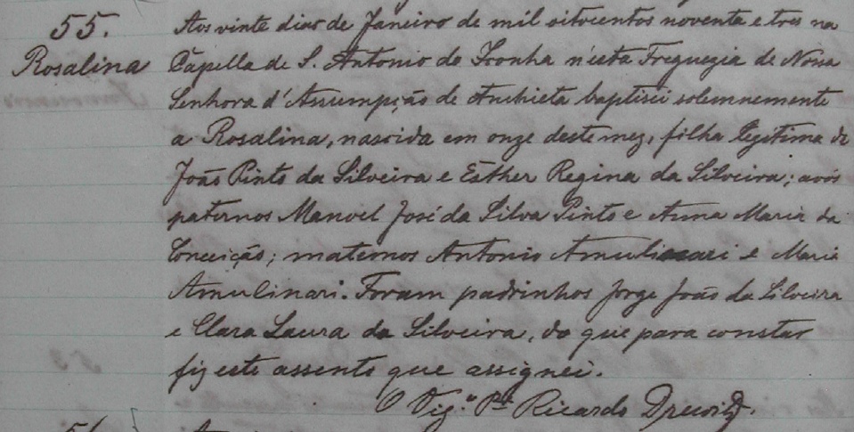 - Rosalina, nascida no dia 11/01/1893, batizada no dia 20/01/1893, na Capela de Santo Antonio de Iconha, na Freguezia de Nossa Senhora da Assumpção de Anchieta-ES