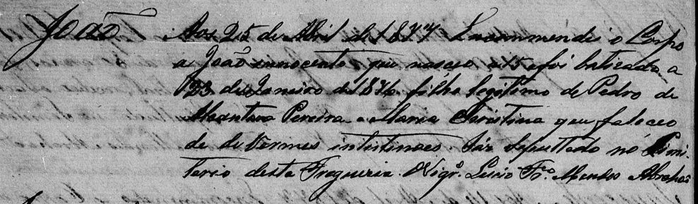 - João, sacramentado o corpo dia 25/04/1877, nasceu no dia 15/01/1871, batizado no dia 23/01/1871, faleceu de vermes intestinais, em Santo Antonio, Rio Acima-MG