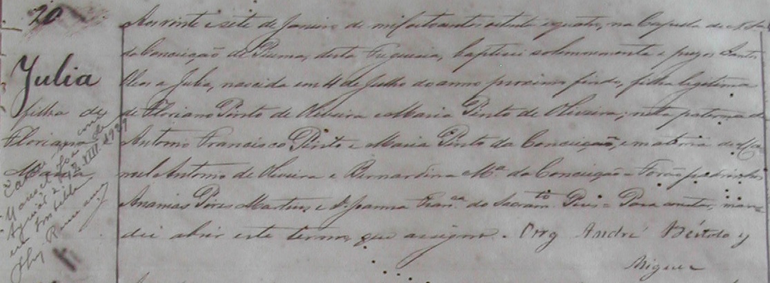 Julia, nascido no dia 04/07/1883, batizada no dia 27/01/1884, na Capela de Nossa Senhora da Conceição de Piuma-ES