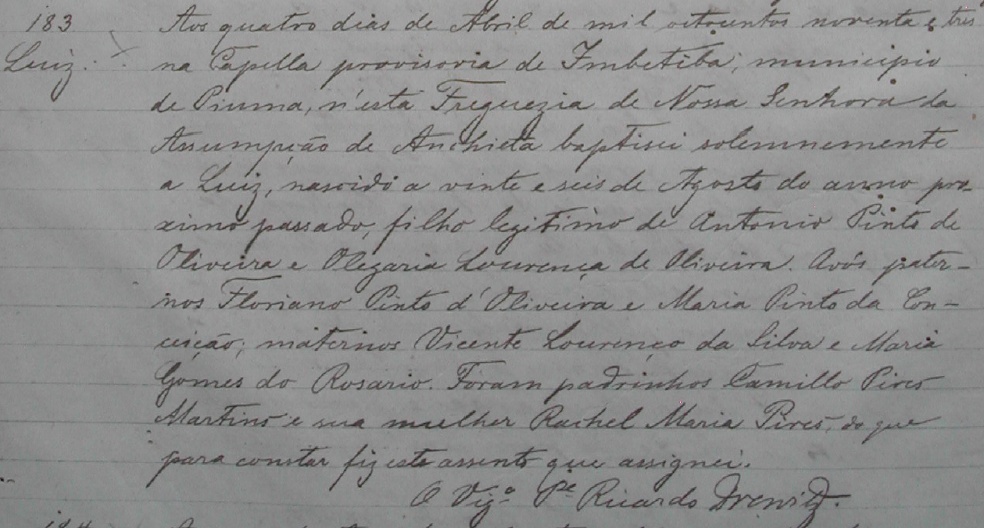 - Luiz, nascido no dia 26/08/1892, batizado no dia 04/04/1893, na Capela provosoria de Imbatiba-ES, Municipio de Piuma-ES