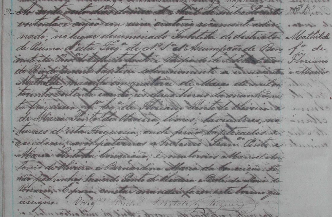 - Maria, nascida no dia 15/12/1876 às 3 horas da tarde, batizada no dia 04/04/1777, na Capela de Nossa Senhora da Conceição de Piuma?, filial da Parochial Igreja de Nossa Senhora da Assumpção da Villa de Benevente-ES