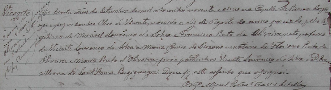 - Vicente, nascido no dia 10/08/1894, batizado no dia 30/09/1895, na Capela de Piuma-ES