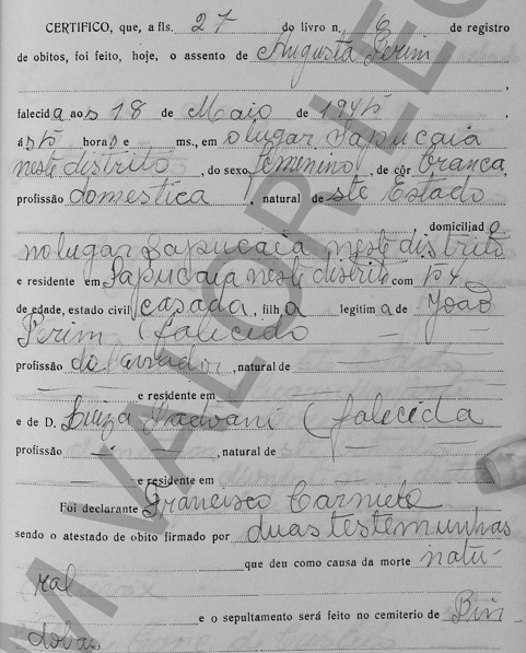 (1890 - Falecida no dia 18/05/1945, com 54 anos de idade, em Sapucaia, Castelo-ES, sepultada no cemitereio de Pindobas)