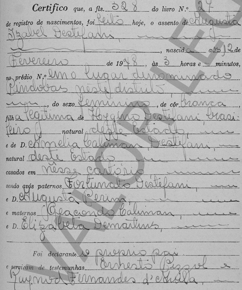 - Augusta izabel Destefani (12/02/1948, às 3 horas, em, Pindobas, Castelo-ES)