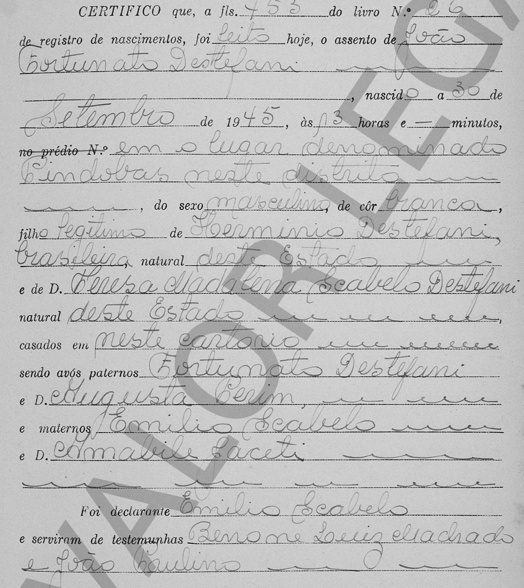 - João Fortunato Destefani (30/09/1945, às 13 horas, em Pindobas, Castelo-ES)