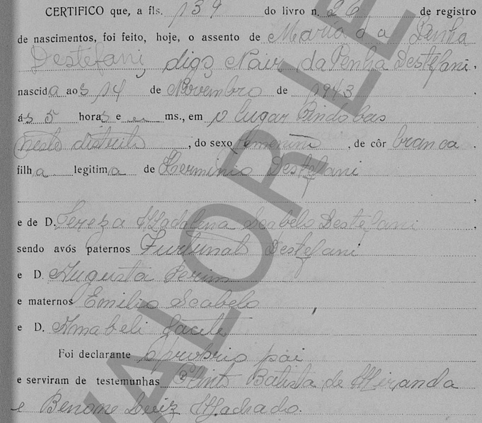 - Nair da Penha Destefani (14/11/1943, às 5 horas, em Pindobas, Castelo-ES)