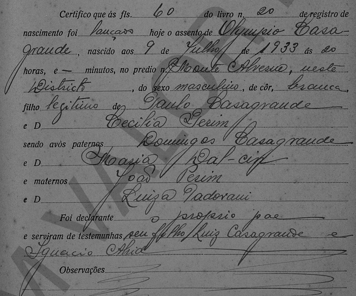 - Olimpio Casagrande (09/07/1933, às 20 horas, em Monte Alverne, Castelo-ES)