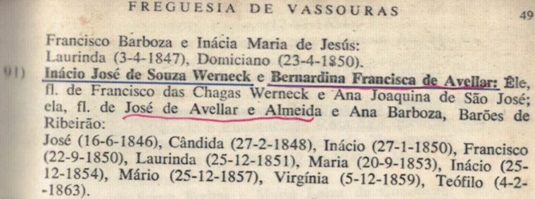 - N18) Ignacio Jose de Sousa Werneck, c.c. Bernardina de Avelar, filha do Barão do Ribeirão, (vêr).