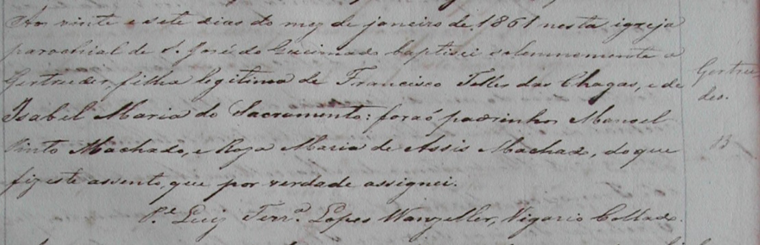 Gertudes, batizada no dia 27/01/1861, em São Jose do Queimado-ES