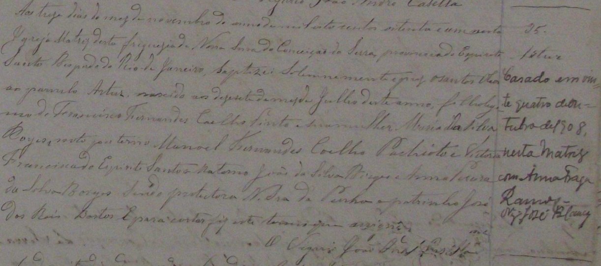 - Artur, nascido no dia 17/07/1881, batizado no dia 13/11/1881, na Igreja Matriz da Freguezia de Nossa Senhora da Conceição da Serra-ES