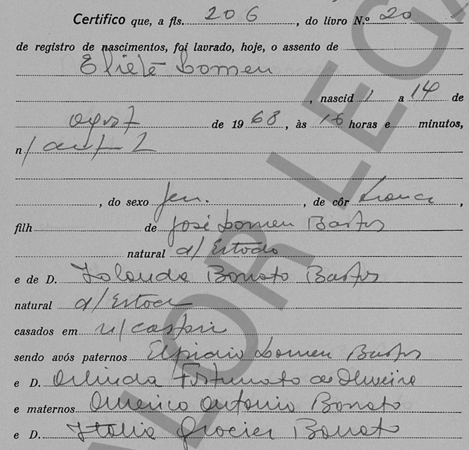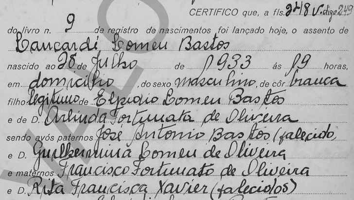 - Lancardi Lomeu Bastos (28/07/1933, branco, às 19 horas, em Santa Anna, Rio Pardo-ES)