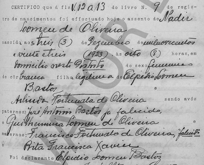 - Nadir Lomeu Oliveira (03/12/1923, branca, às 8 horas, em Santa Anna, Rio Pardo-ES)