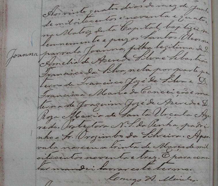 - Joanna, nascida no dia 30/03/1893, batizada no dia 24/06/1894, na Matriz de Vitoria-ES