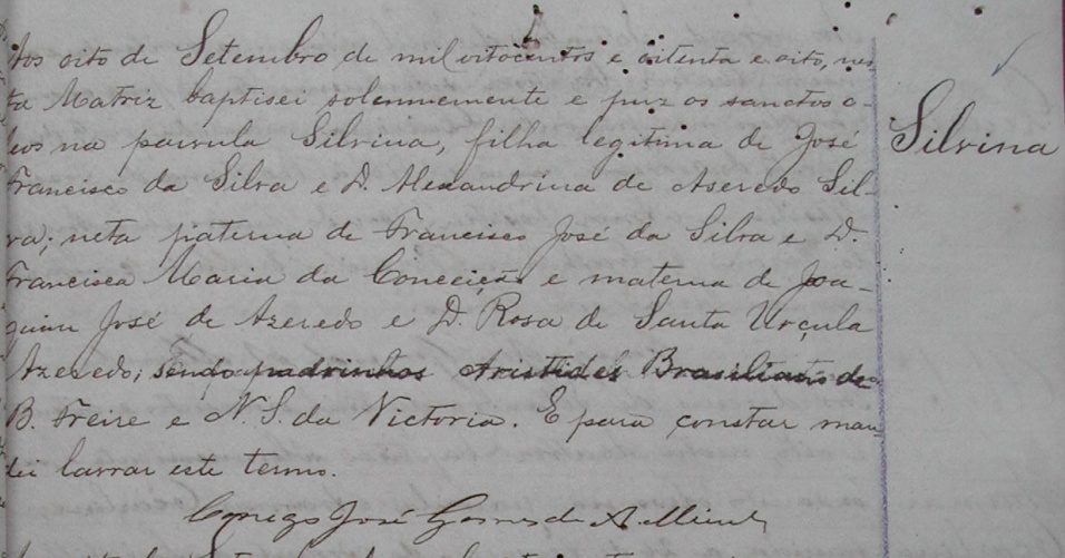 Silvina, batizada no dia 08/09/1888, na Matriz de Vitoria-ES