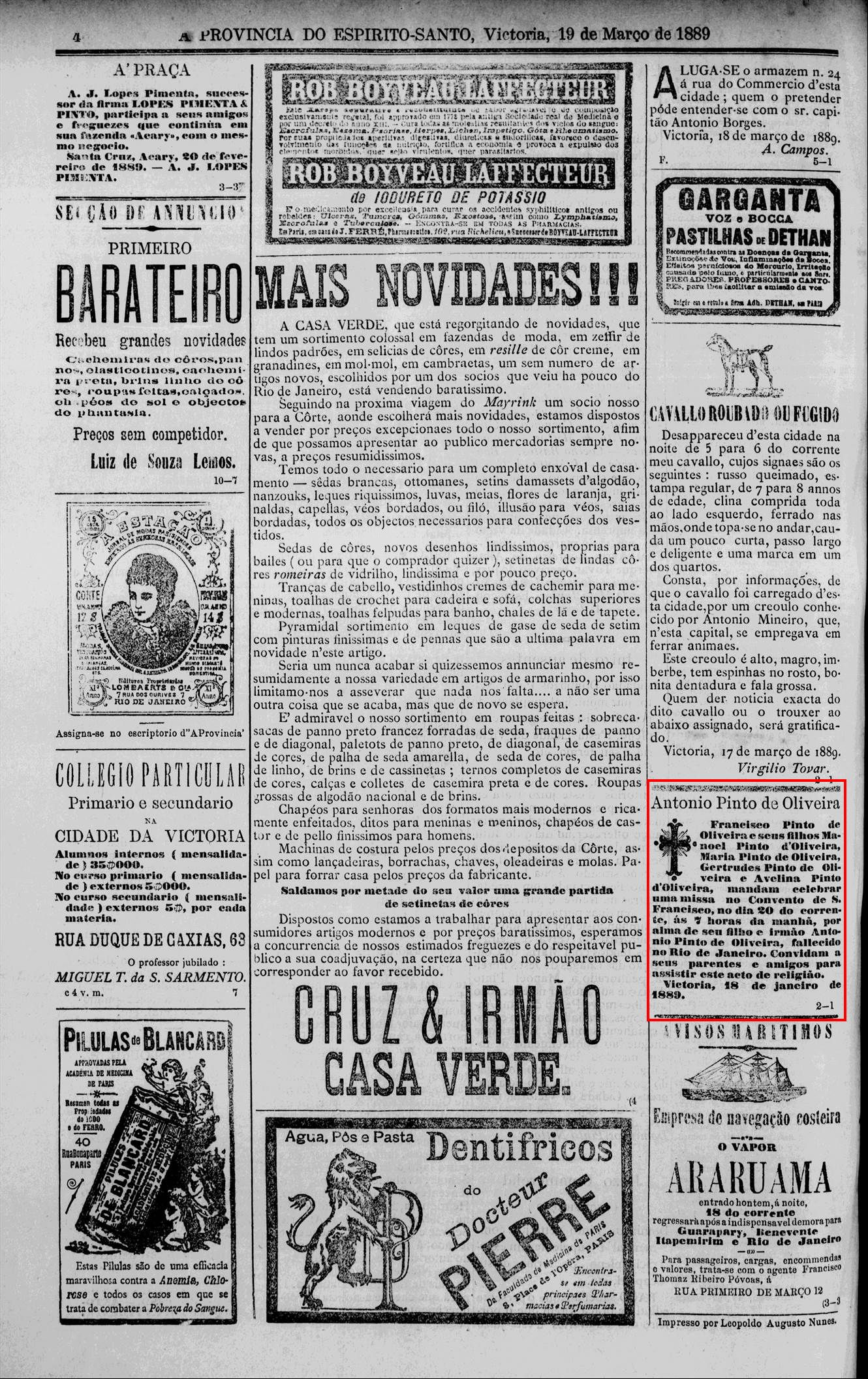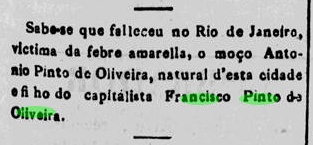 1889 - Falecimento de Antonio Pinto de Oliveira