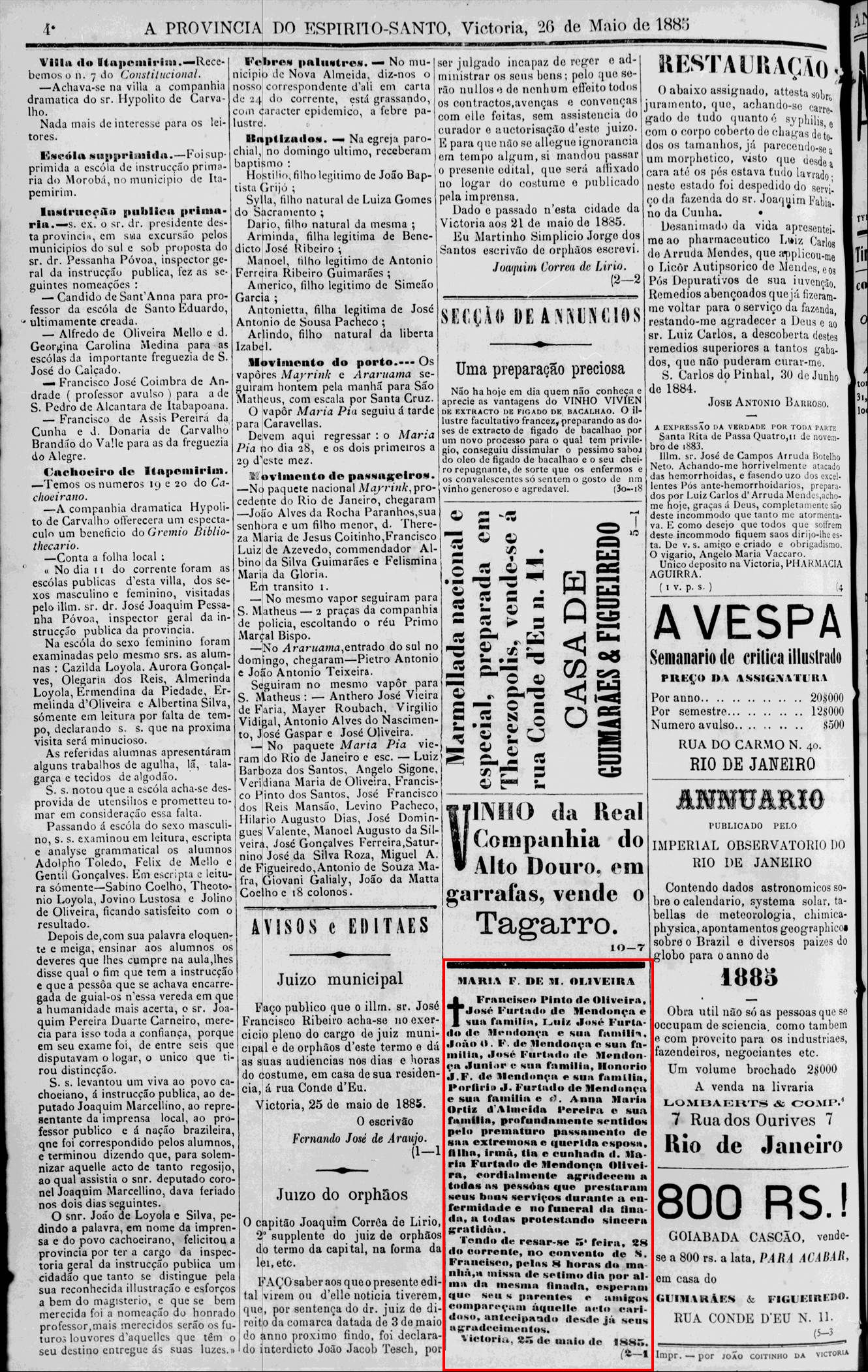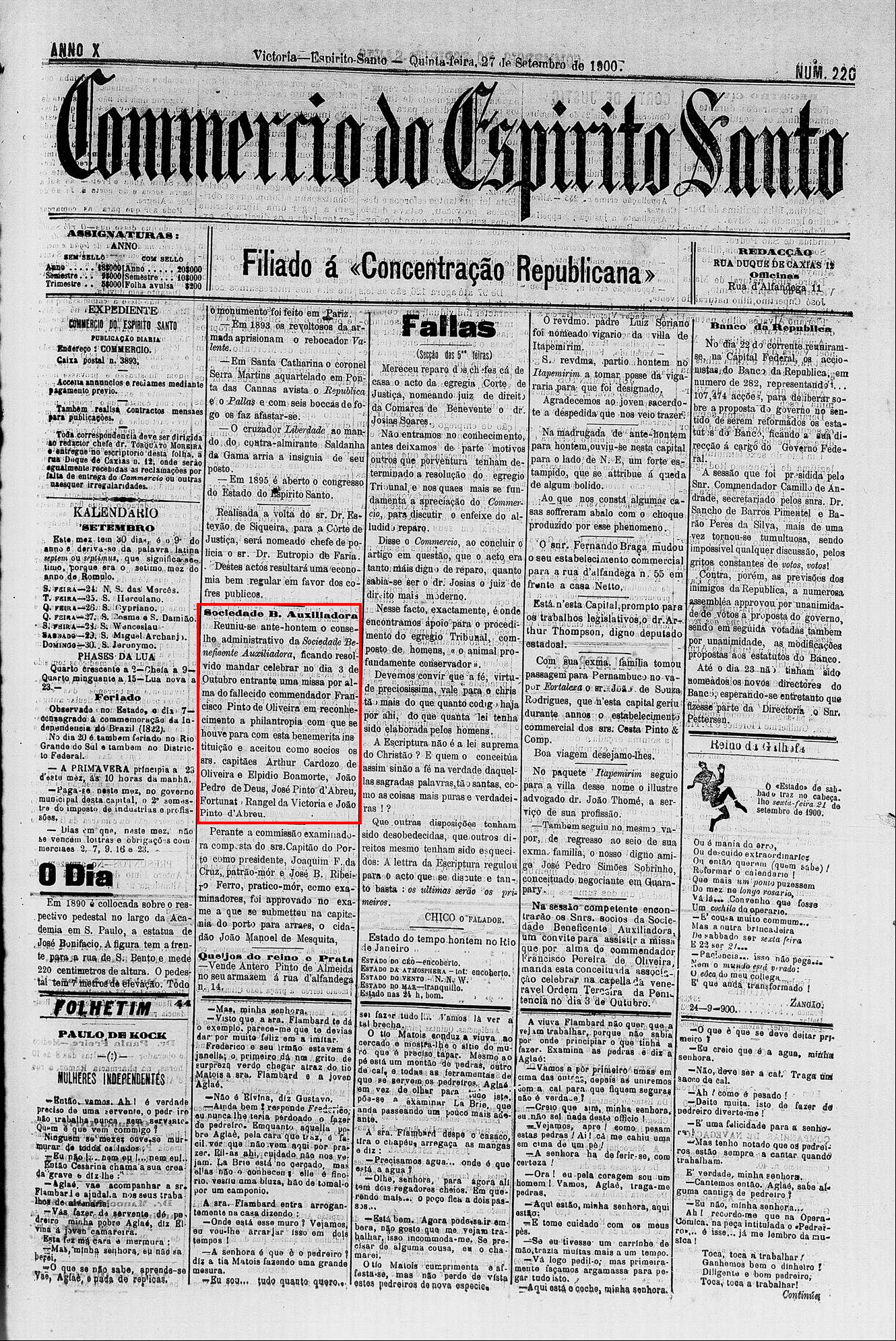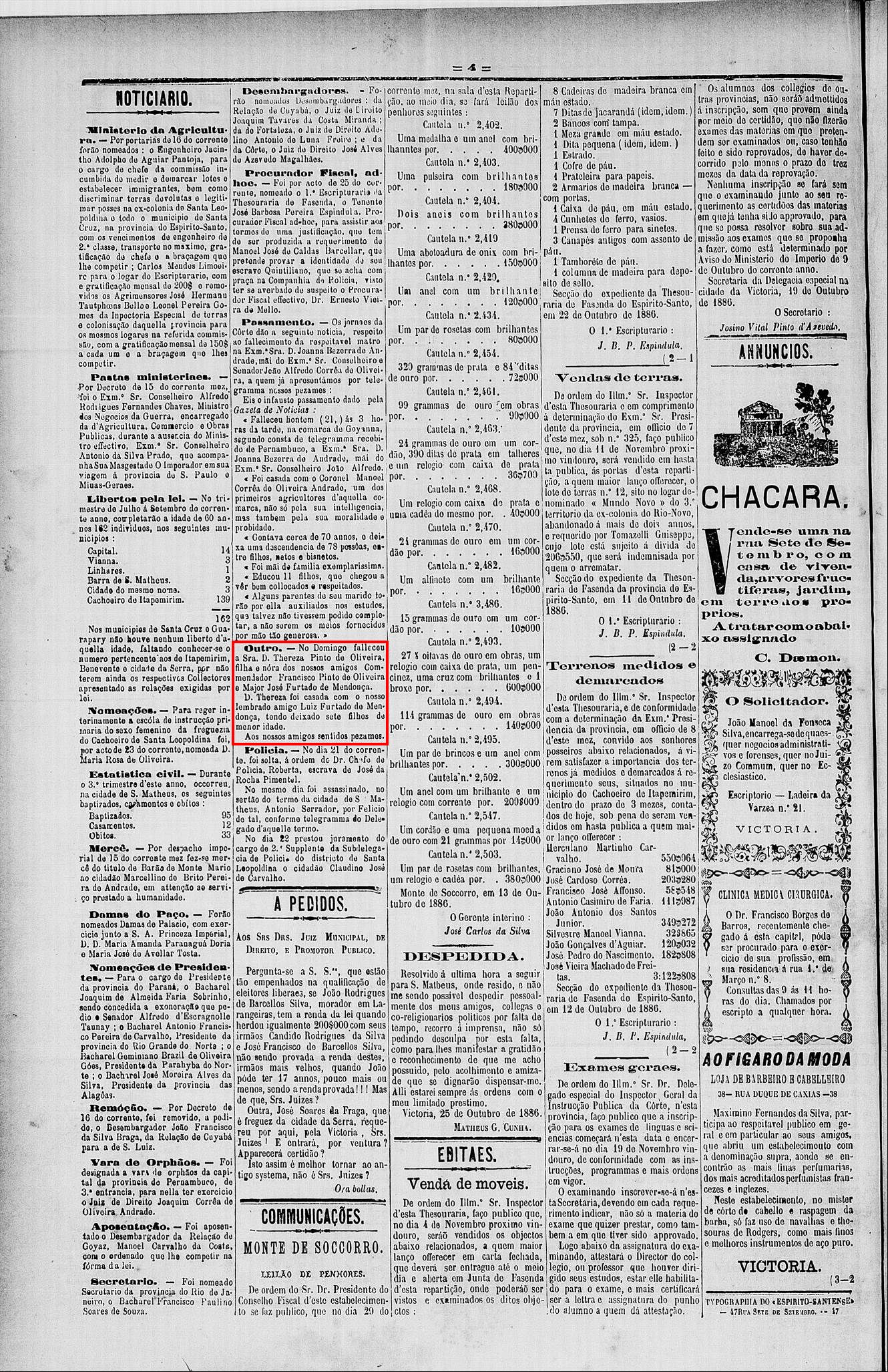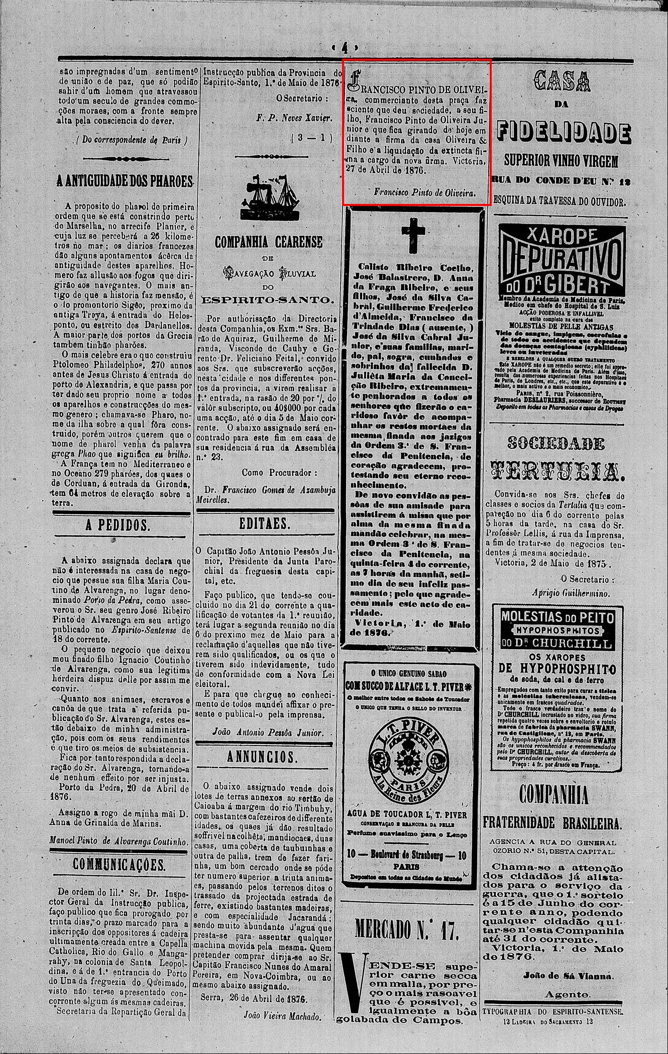 (Nota no Jornal da Vitoria em 1864)
