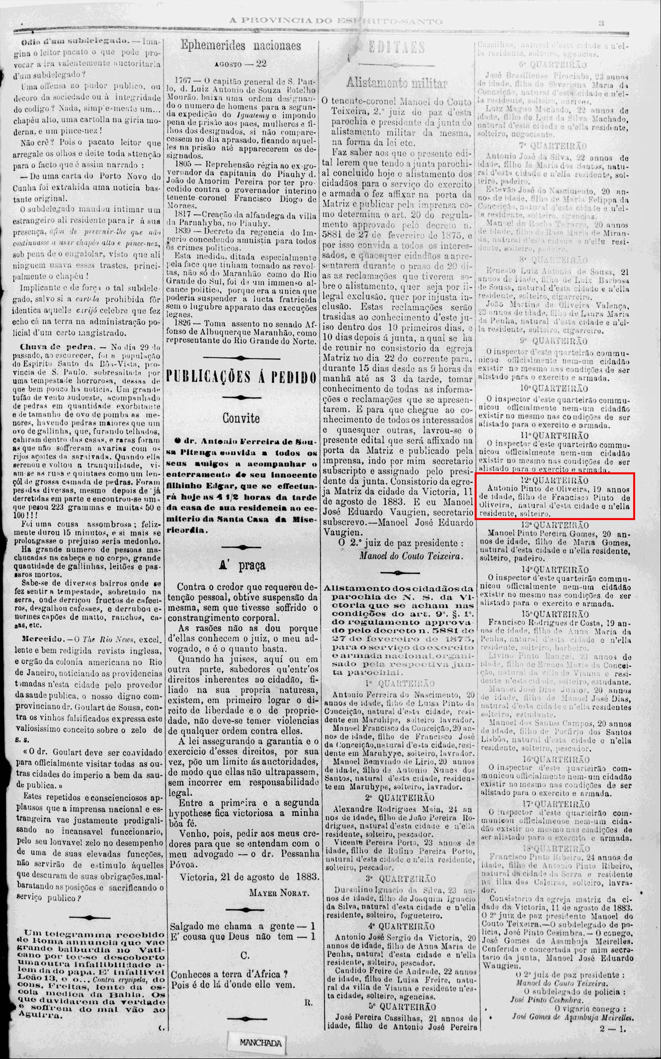 - Antonio Pinto de Oliveira, 19 anos de idade em 1883, conforme alistamento militar, em jornal abaixo