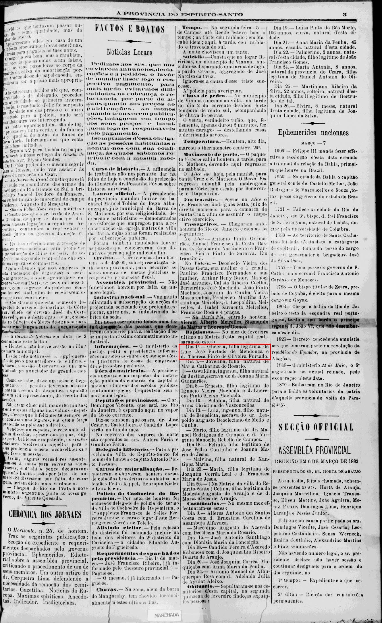 - Gliceria, batizada em 1883, conforme jornal abaixo