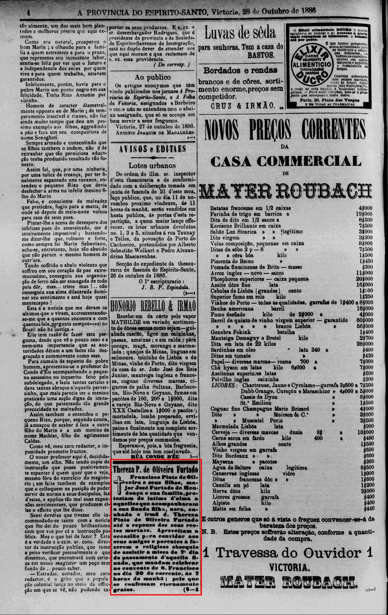1886 - Falecimento de Thereza Pinto de Oliveira Furtado