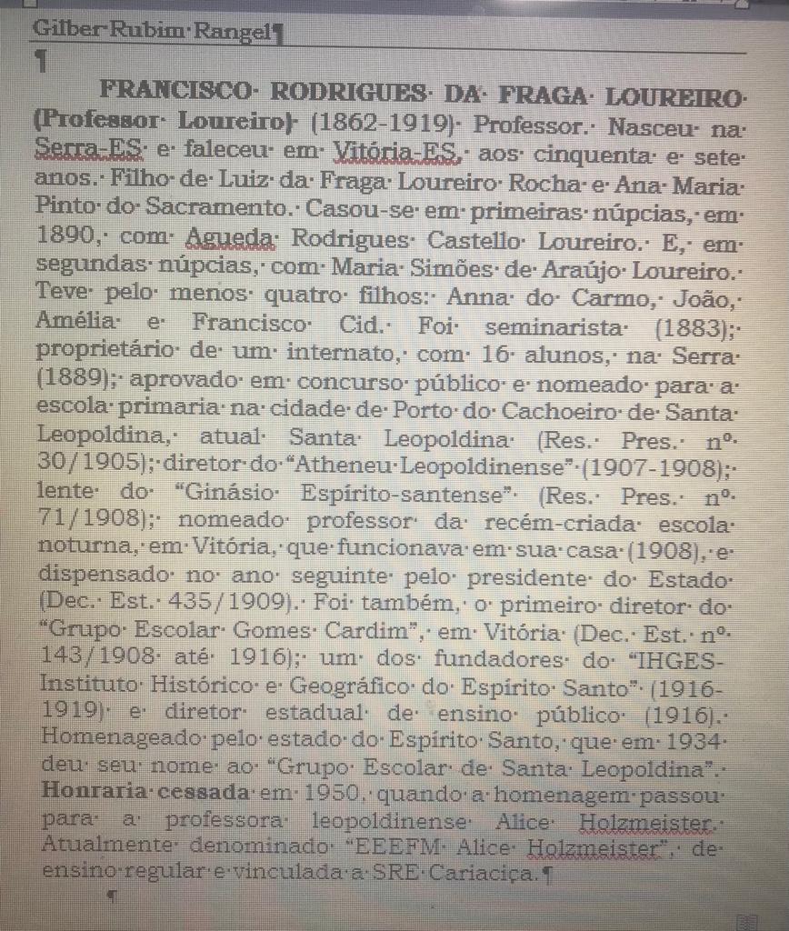 Reverendo Francisco Rodrigues da Fraga Loureiro, padrinho de Othilia Joanna, batizada no dia 06/01/1887, na Matriz da Serra-ES