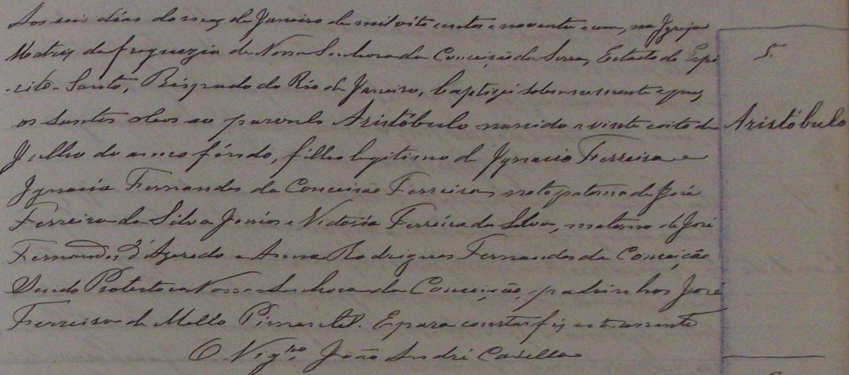 - Aristobulo, nascido no dia 28/07/1890, batizado no dia 06/01/1891, na Igreja Matriz da Freguezia de Nossa Senhora da Conceição da Serra-ES