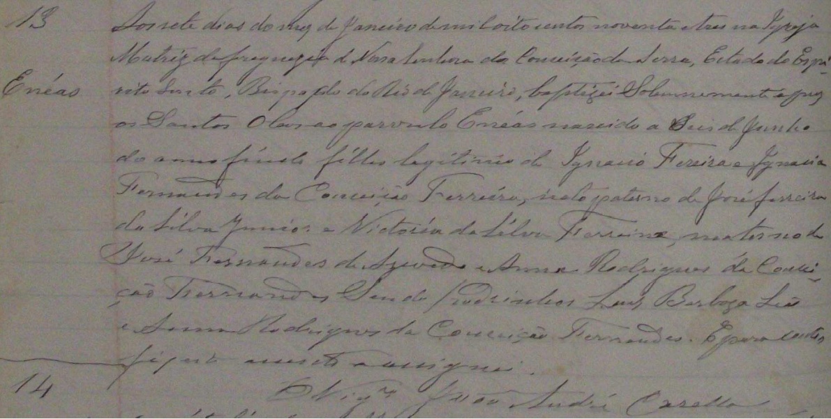 - Eneas, nascido no dia 06/06/1892, batizado no dia 07/01/1893, na Igreja Matriz da Freguezia de Nossa Senhora da Conceição da Serra-ES
