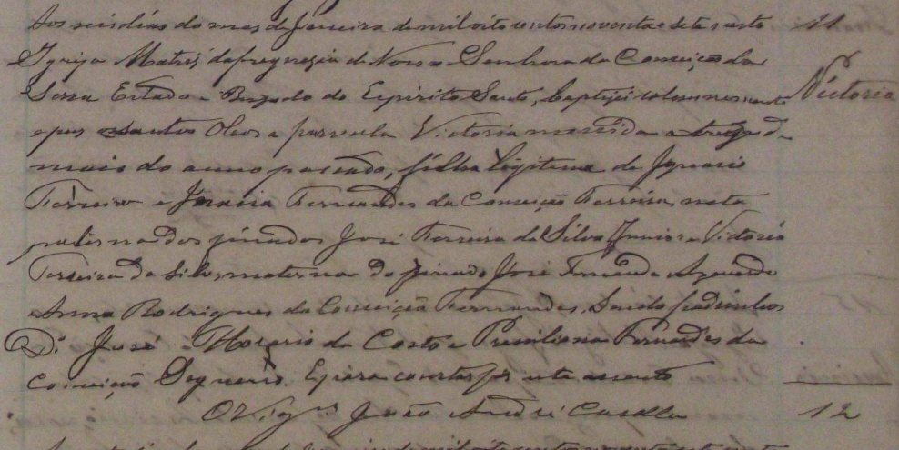 - Victoria, nascida no dia 13/05/1896, batizada no dia 06/01/1897, na Igreja Matriz da Freguezia de Nossa Senhora da Conceição da Serra-ES