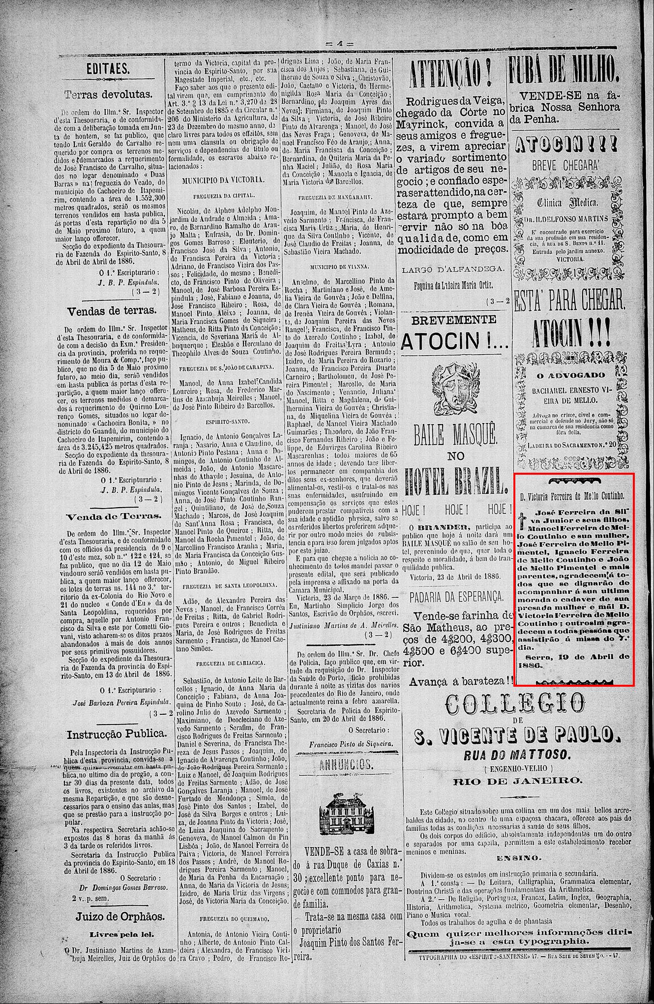 1886 - Falecimento de Victoria Ferreira Mello Coutinho