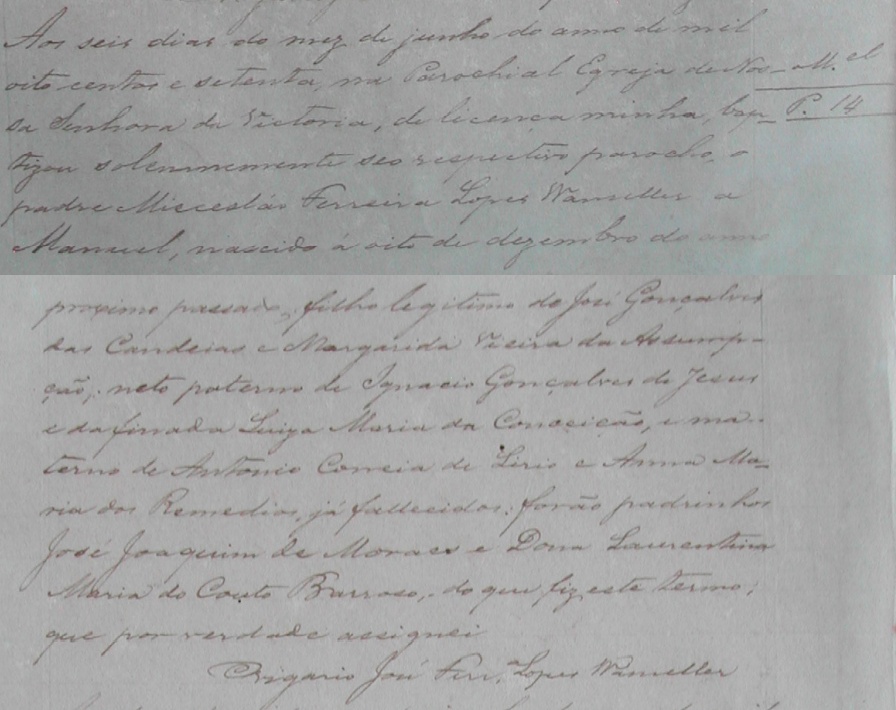 - Manoel, nascido no dia 08/12/1869, batizado no dia 06/06/1870, na Parochial Igreja de Nossa Senhora da Vitória (Queimados-ES)