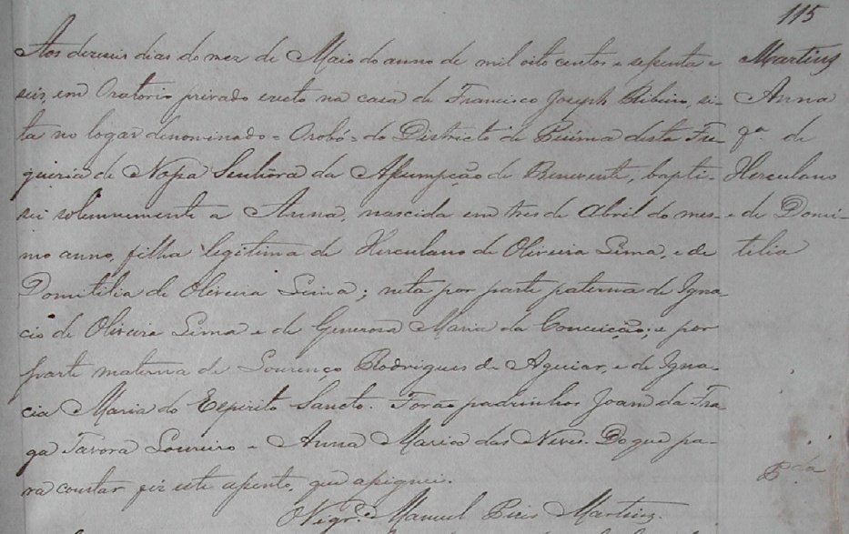 - Anna, nascida no dia 03/04/1866, batizada no dia 16/05/1866, em um Oratório privado, na casa de Francisco Jose Ribeiro, no Distrito de Piuma-ES