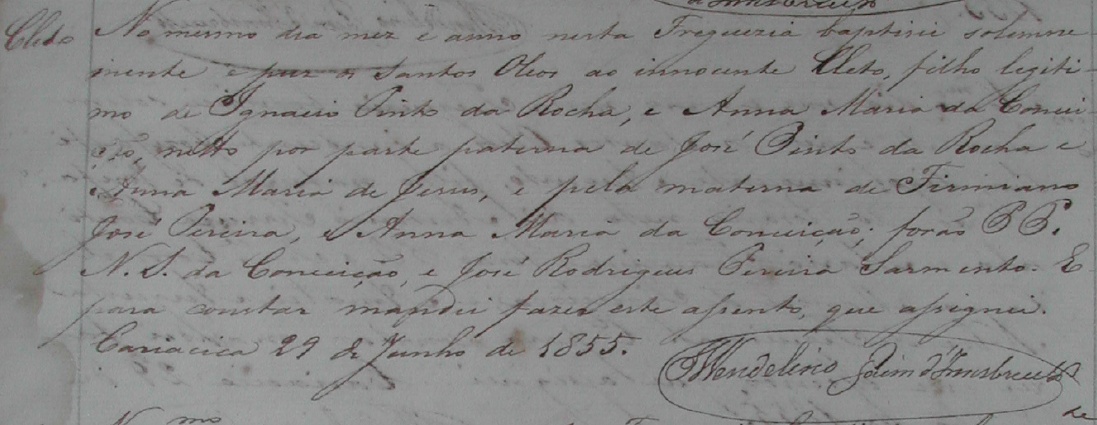 - Cleto, batizado no dia 29/06/1855, na Freguezia de Cariacica-ES