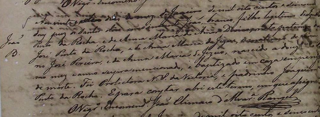 - João, nascido no dia 02/01/1852, batizado no dia 27/01/1852, em casa, em perigo de morte, em Vitoria-ES
