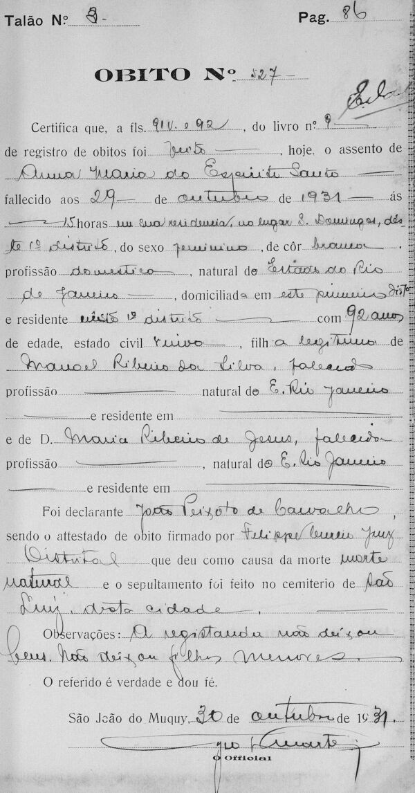 Mãe: (Hipotese) Ana Maria do Espirito Santo (*1839), viúva, natural do Rio de Janeiro, falecida no dia 29/10/1931, às15 horas, com 92 anos de idade, em Muqui-ES