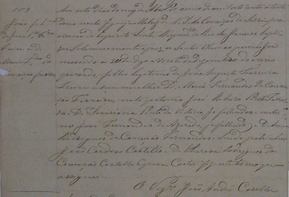 - João, nascido no dia 20/12/1881, batizado no dia 08/04/1882, na Igreja Maytriz de Nossa Senhora da Conceição da Serra-ES