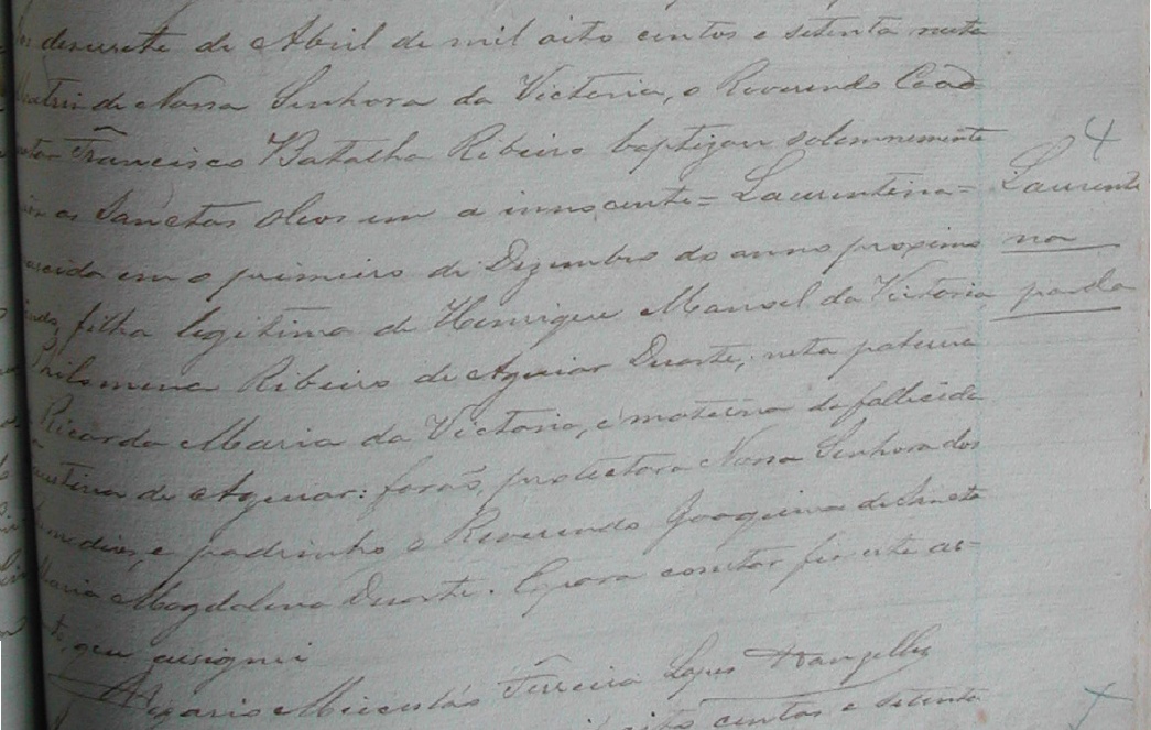 - Laurentina (Parda), nascida no dia 01/12/1869, batizada no dia 17/04/1870, na Matriz de Nossa Senhora da Vitoria-ES