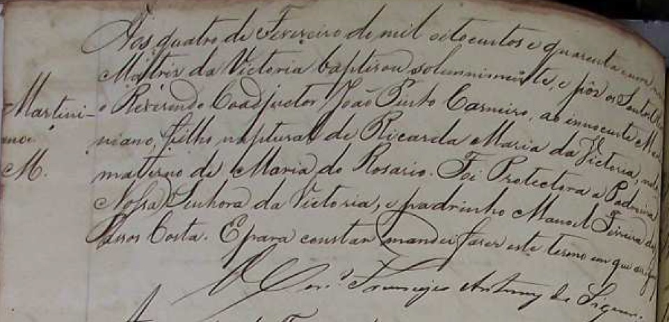 - Martiniano (M - Filho natural), batizado no dia 04/02/1849, na Matriz de Vitoria-ES
