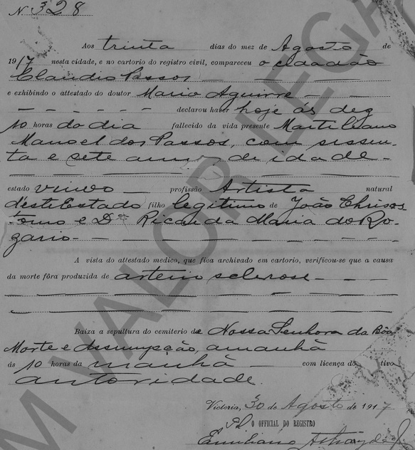 Falecido no dia 30/08/1917, viuvo, artista
