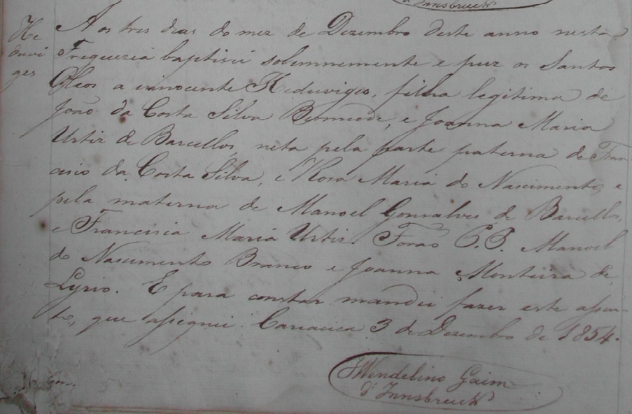 Heduviges, batizada no dia 03/12/1854, na Freguesia de Cariacica-ES