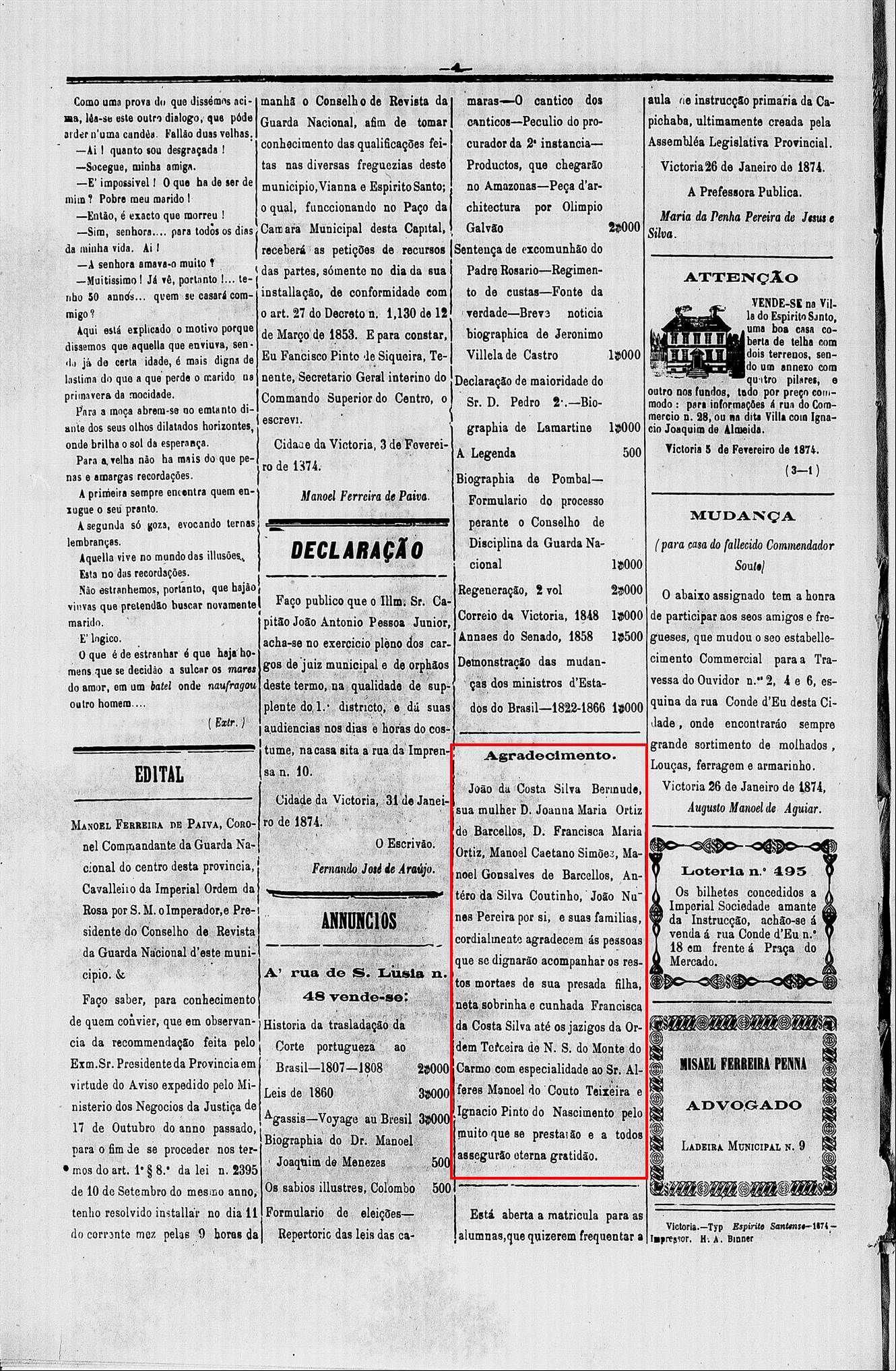 - Francisca da Costa e Silva, falecida em Jan/1874, conforme jornal abaixo
